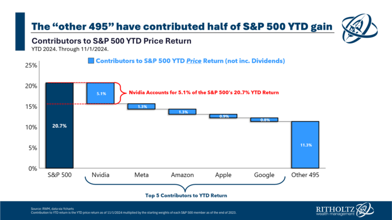 Of course, the biggest stocks tend to have outsized control of the returns in a market cap weighted index (by design). Five stocks are responsible for around half the gains on the S&P 500 this year: