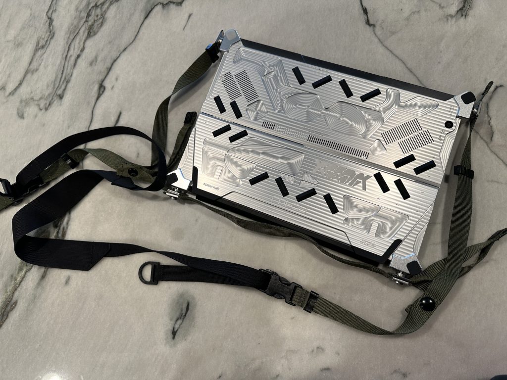 The exoskeleton of the RMT02 features four clip attachment points where a somewhat complex sling can be deployed. The sling allows you to carry it over your shoulder sans bag – and yes, it integrates with Acronym’s Interops jacket system that lets you slide it under the tail of your Gore-Tex to protect it from the rain. It also clips in at 4 points to let you compute while standing up. It all works, really well actually. I don’t know how many times you’d use something like that, or carry it outside of a bag, but it’s absolutely functional.