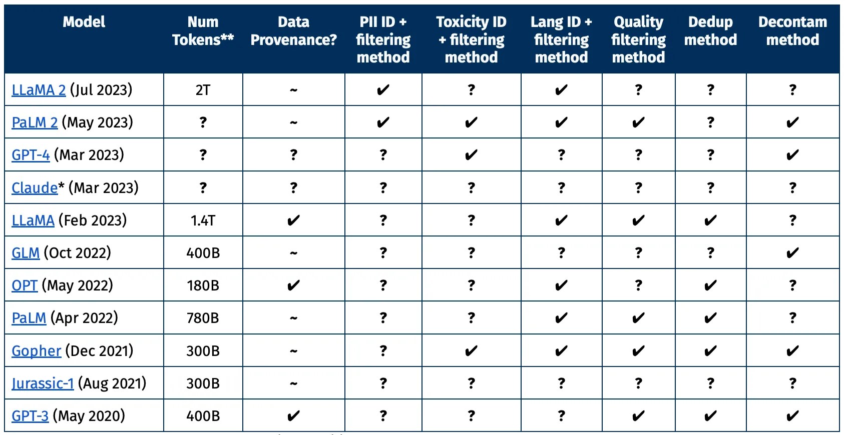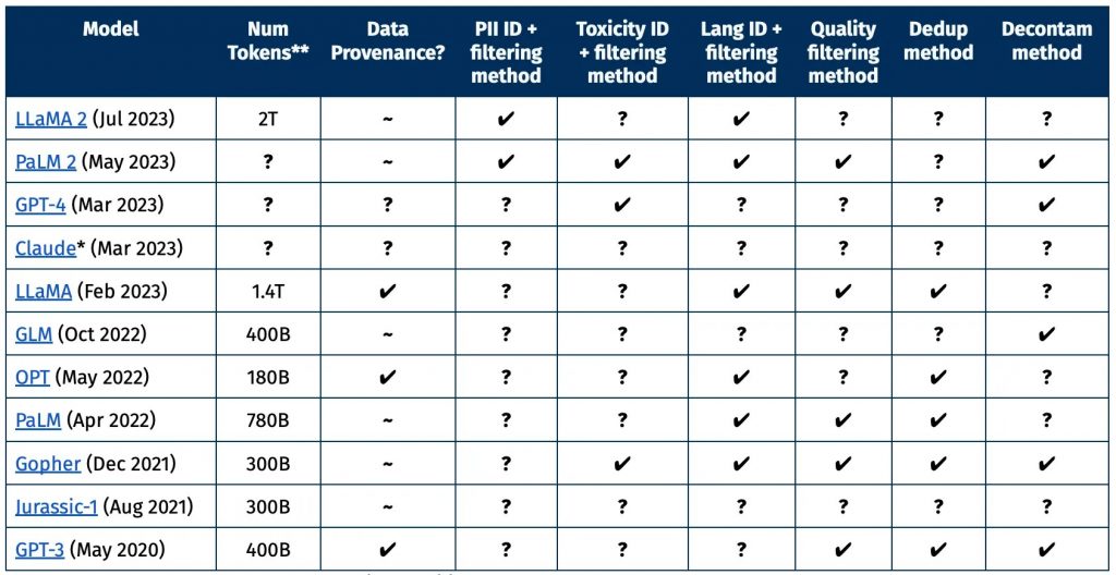 You can see in this chart created by AI2 that the largest and most recent models only provide some of the information that a researcher would likely want to know about a given dataset. What information was removed, and why? What was considered high versus low-quality text? Were personal details appropriately excised?