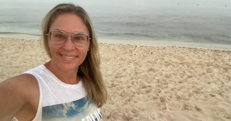 The author poses on a beach in Cozumel, Mexico, where she met a stranger from England who shared her menopause struggles.