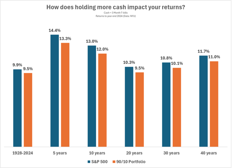 A small strategic allocation to cash doesn’t have a huge impact on your returns. I looked at the differences in annual returns over various time frames using a 100% allocation to the S&P 500 and a 90/10 portfolio made up of 90% stocks and 10% cash (3 month T-bills):