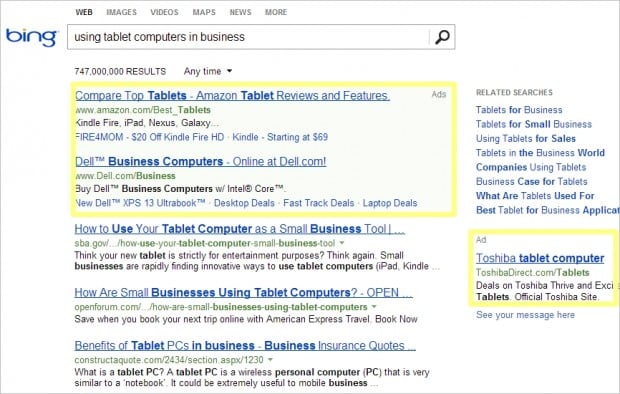 - Paid search results — As the phrase implies these are purchased ads. You buy text ads that show up at the top or top right column of the page. They are commonly called “pay per click ads” because most of the time the advertiser pays only when someone clicks on the ad. In Google these are called AdWords. In Microsoft’s Bing they are called Bing Ads.